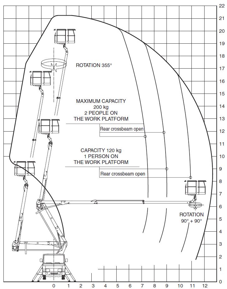Legnagyobb munkamagasság: 21 m Legnagyobb oldalkinyúlás: 12 m (1 személlyel, max. 80kg) Ideális homlokzatok tisztítására, javítására, ereszek tisztítására, fák metszéséhez, visszavágásához, villanyszerelési munkákhoz (feszültség mentesített hálózaton).